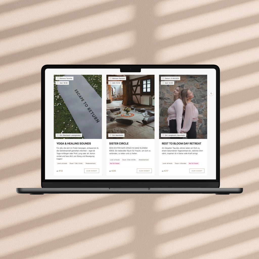 Übersichtliche Darstellung der verfügbaren Retreats und Events mit direkter Buchungsmöglichkeit